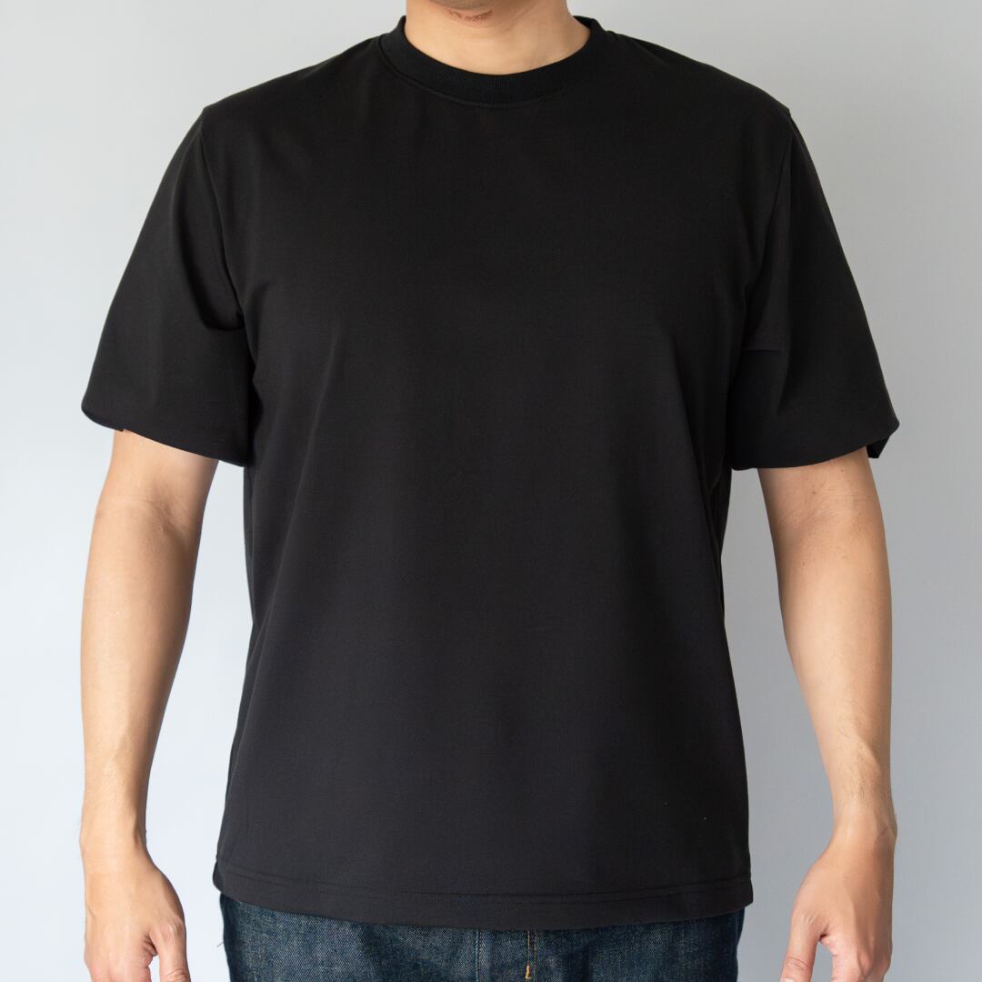 見た目は王道のクルーネックTシャツですが、表と裏を編み分け、表には自然な風合いになるよう開発したポリエステルを使用、裏側には極細の特殊なポリマーを複合したポリエステル糸を使用することで、見た目はコットン、機能性はスポーツウェアのようによく伸縮し、ケアも簡単な、新しいTシャツを開発しました。