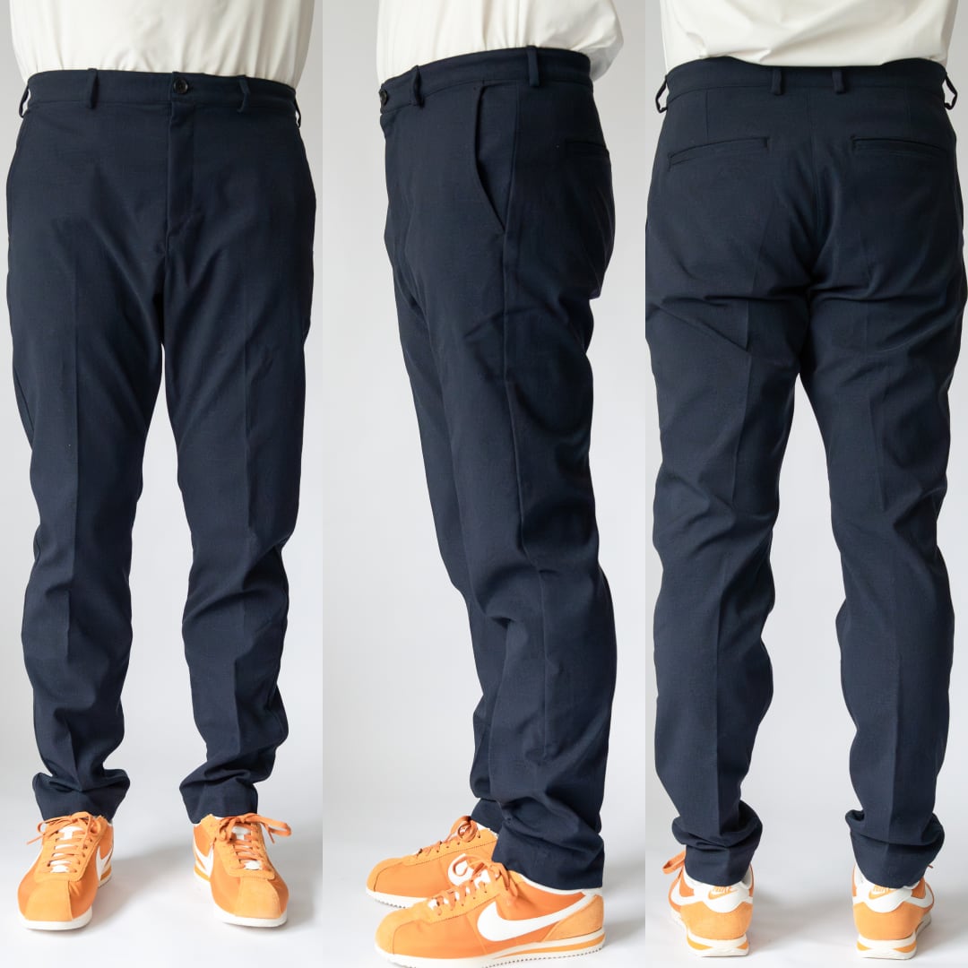 ワークパンツのようにどんなシチュエーションでも動きやすい素材と、スラックスのフォーマルなデザインを融合したのがこの「キタキテスラックス」です。