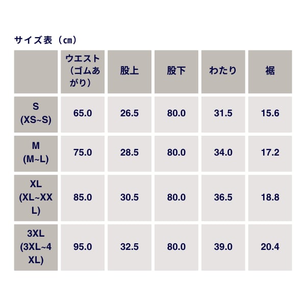 ウエストゴム仕様のため、幅広い体型にフィットします。普段お使いのサイズに合わせて、以下のサイズをお選びください。