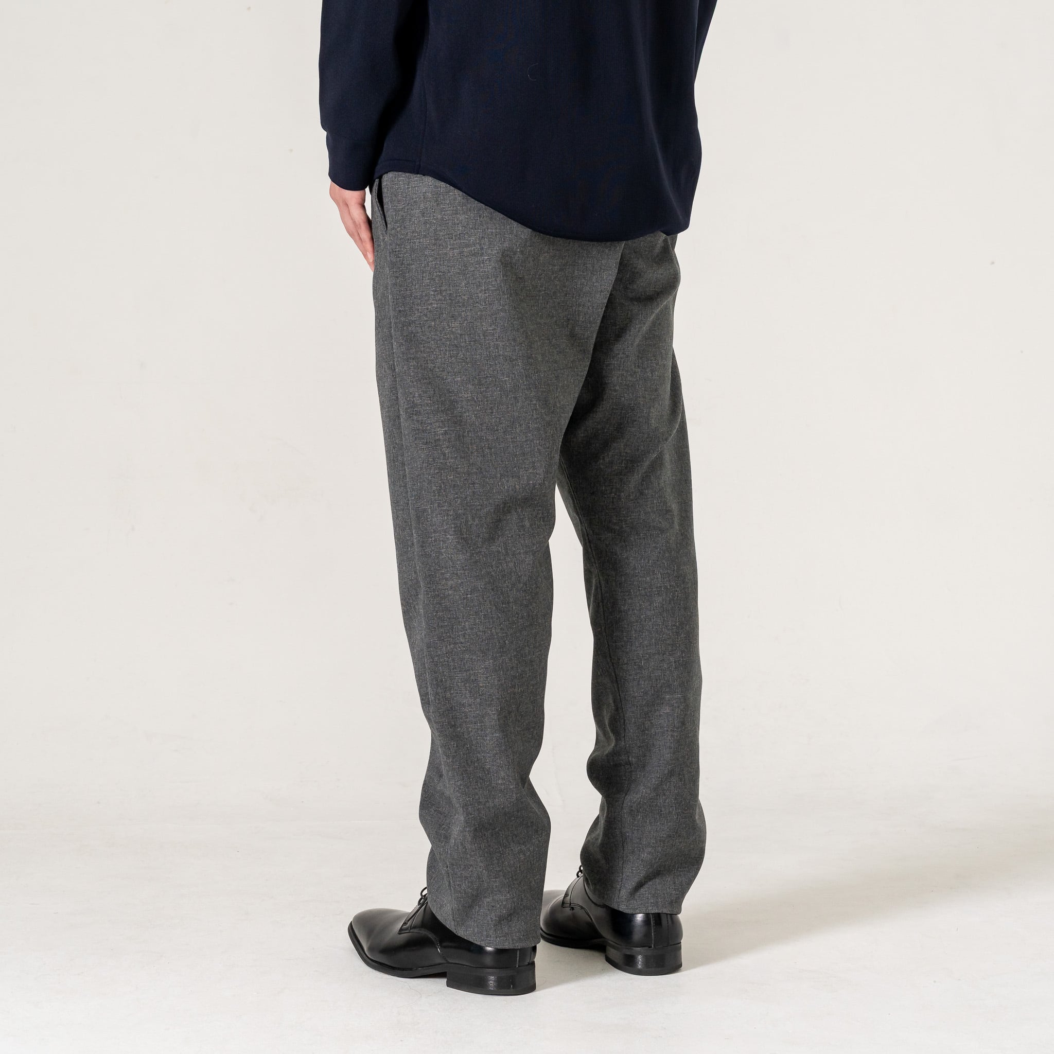 一見すると上品なウールライクなスラックス。バックポケットを無くしたことで、座っても歩いても、お尻周りのゴワつきや引っかかりがありません。どこまでも軽やかで、心身ともにリラックスできる穿き心地を実現しました。