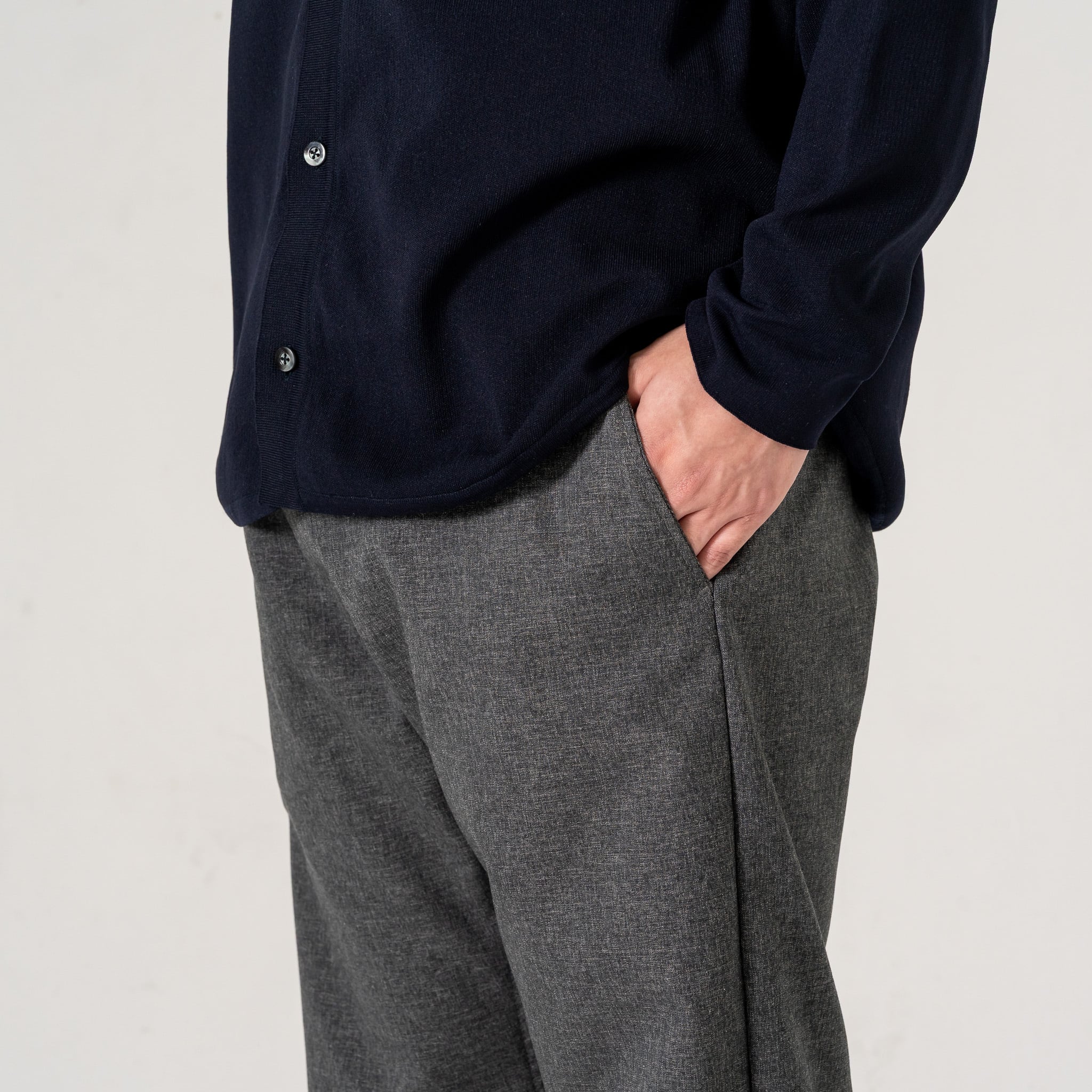 見た目は上品なスラックスですが、素材はスポーツウェアのように伸縮します。自宅で丸洗いできて数時間で乾き、アイロンも不要。部屋でのひとときから仕事、街歩きまで、これ一本あれば他のパンツを選ぶ手間がなくなります。機能美を追求し、価格も抑えた万能な一着です。