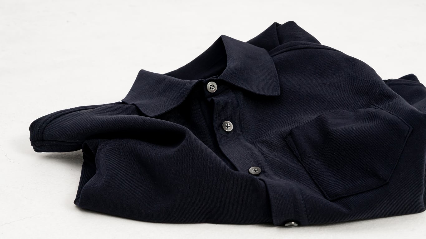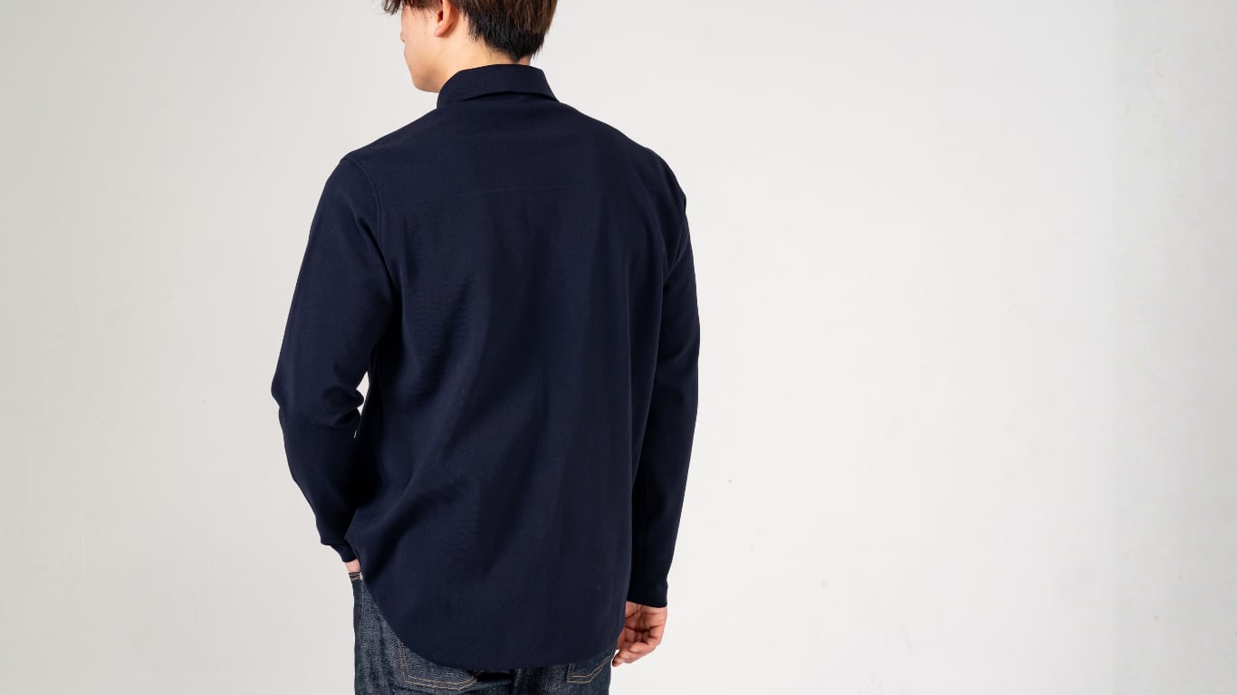 シャツの襟元には通常、形を保つための「芯地(しんじ)」という固いパーツが隠されています。 しかし、それが首元の窮屈さや、肌当たりの違和感を生む原因でもありました。泉大津シャツは、この芯地を一切使いません。芯地に頼らずとも美しい襟の立ち上がりを維持できるのは、泉大津の高度な技術があるからこそ。 首元までしっかりとした伸縮性を確保することで、第一ボタンを留めても喉元を締め付ける感覚がなくなりました。
